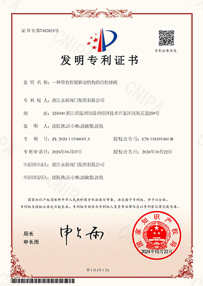 发明专利证书-一种带有控制驱动机构的自控球阀