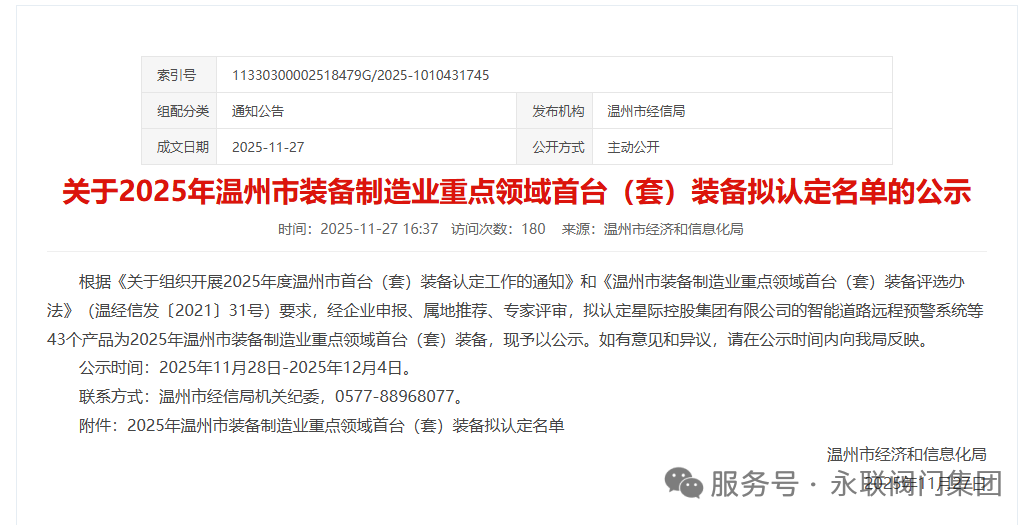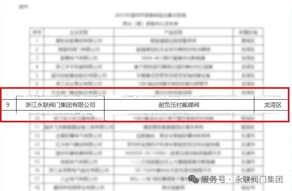 近日,温州市经济和信息化局对2025年度装备制造业重点领域首台(套)装备拟认定名单进行公示,共有43个创新产品入选,涵盖智能电气、高端阀门、新能源装备、环保设备等多个的创新产品成功入选。其中,浙江永联阀门集团有限公司凭借自主研发的DN2600大口径“耐负压衬氟蝶阀”强势突围荣耀上榜,成为高端阀门领域的亮眼标杆。