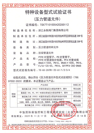 公司座落于有温州经济技术开发区滨海园区。 占地面积三万多平方米,现有员工200余人,中级人员12人,高级工程师5人。 公司引进国内外先进的制造工艺和严密的质量管理体系,产品设计新颖、结构精良、检测完备,并已通过 ISO9001:2000国际质量体系认证,并取得特种设备制造许可证。公司始终走“产、学、研”道路,自主创新、自主研发。已成功开发“大口径1800mm/2000mm新型高性能衬氟蝶阀”和“二道新密封平衡式控制阀”。这两项成果已申报国家发明专利,属国内外首创项目,并已通过省级技术鉴定,其各项技术指标都领先国内外,它不但技术含量高,而且实用性更强,深受用户认可。公司发展至今承蒙社会各界人士与广用户的大力支持,现已成为国内制造“防腐蚀”阀门及管件企业中的骨干企业。